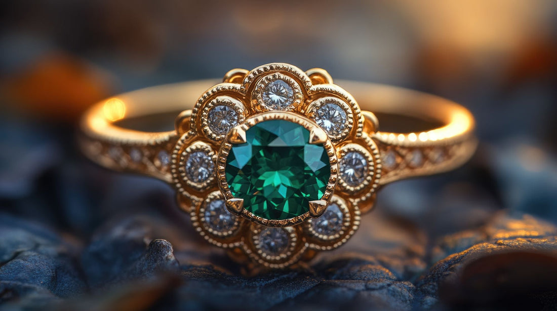 - Ouro com esmeraldas - Se pretende um look clássico e luxuoso, um anel de ouro com esmeraldas pode ser a escolha perfeita. O tom quente do ouro complementa harmoniosamente os tons verdes profundos da esmeralda.