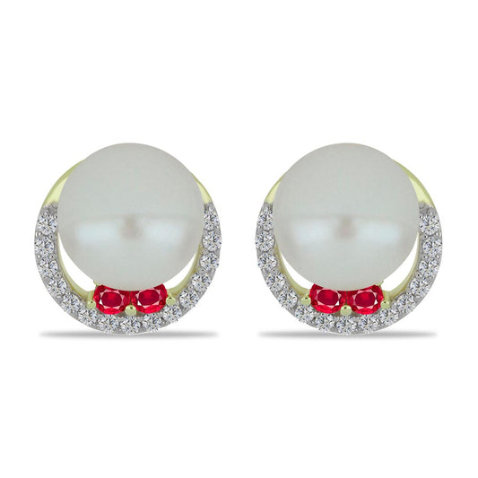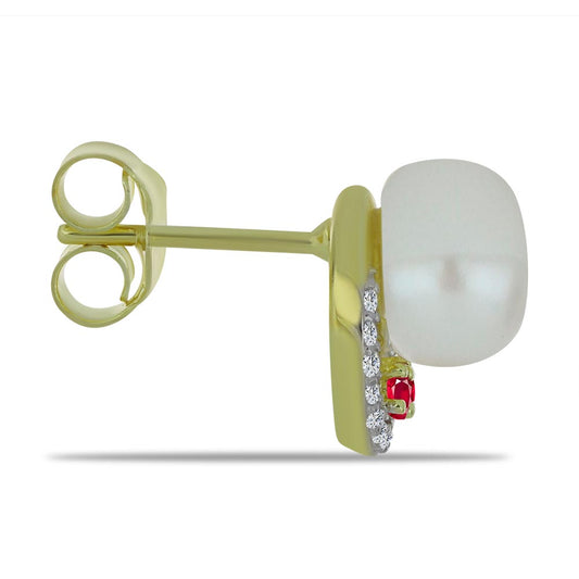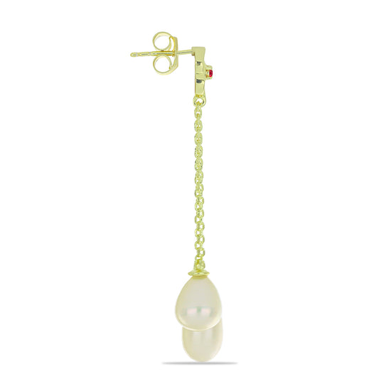 Brincos de Prata com Banho de Ouro com Pérola Branca de Água Doce e Rubi de Madagáscar