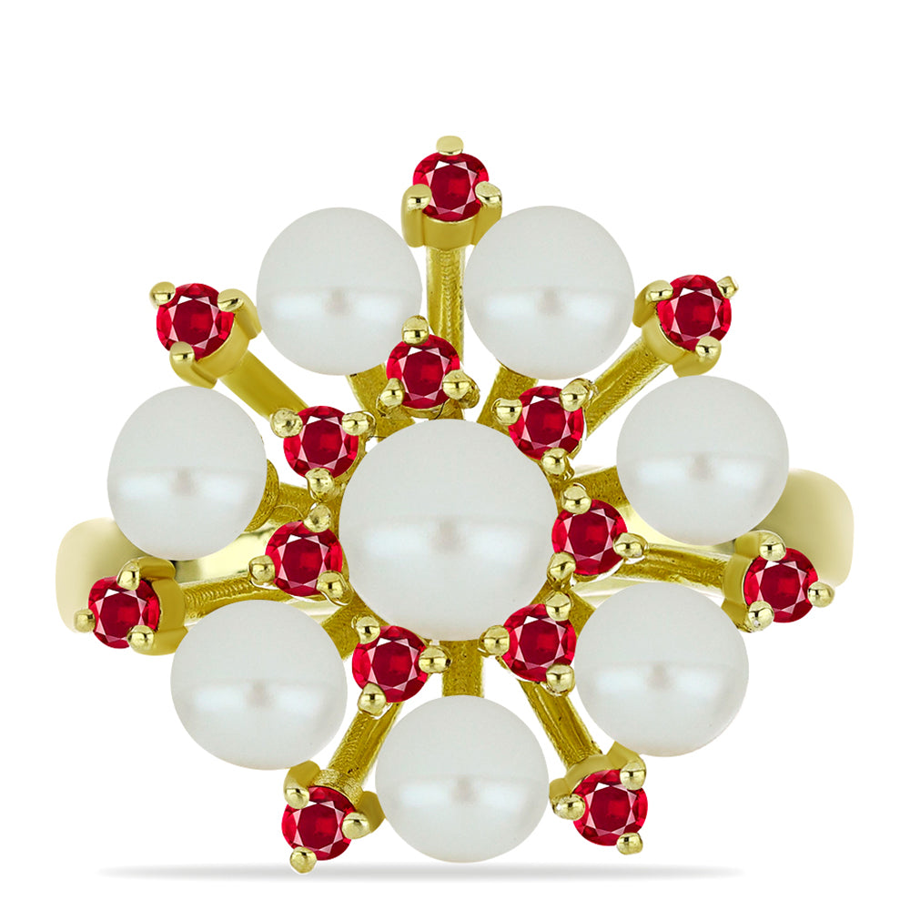 Anel de Prata com Banho de Ouro com Pérola Branca de Água Doce e Rubi de Madagáscar / carat: 5.62 / peso apróx. 5.11 gr. CÓDIGO: Y59589 Tamanho da jóia: 18.75 mm x 21.20 mm Contraste: Cabeca de Veado (800)