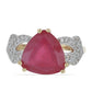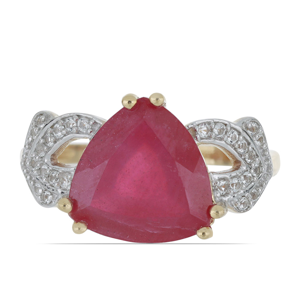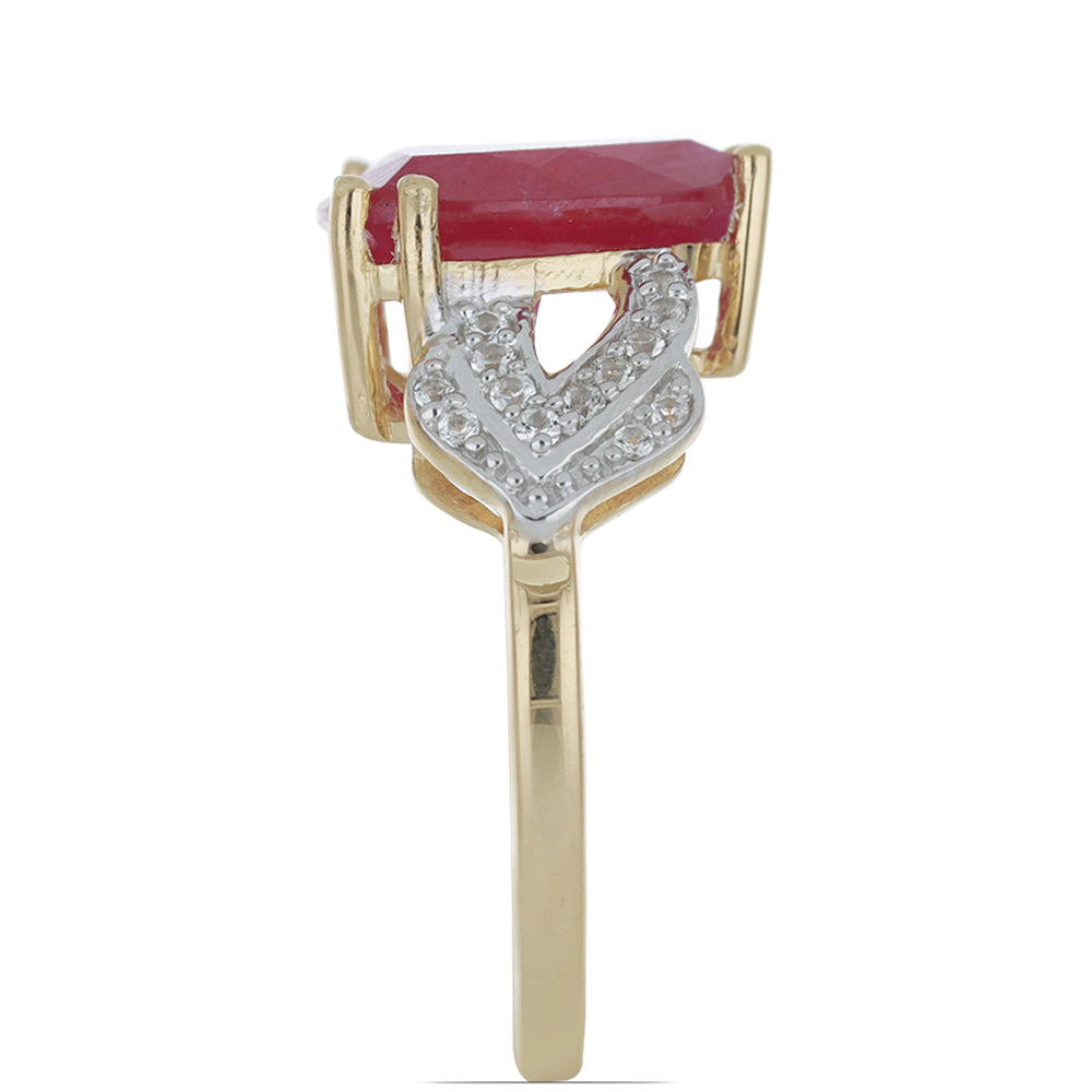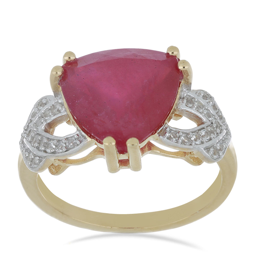 Anel de Prata com Banho de Ouro com Rubi de Madagáscar e Topázio Branco / carat: 7.01 / peso apróx. 4.49 gr. CÓDIGO: Y46622 Tamanho da jóia: 12 mm x 23 mm Contraste: Cabeca de Veado (800)
