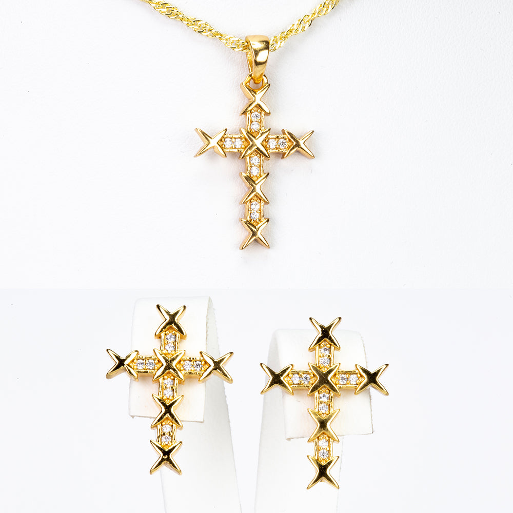Cruz Conjunto de Liga de Ouro com Cristal Emporia® Branco ( Colar+Brincos+Pendente ) / peso apróx. 8.33 gr. CÓDIGO: 34339
